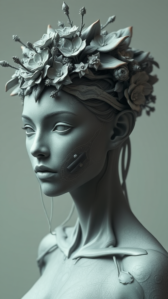 A hyper-realistic sci-fi sculpture of a woman adorned with an intricate, nature-inspired crown, crafted in ZBrush style, featuring detailed depictions of flora and fauna winding through the crown, accentuating a monochrome palette that highlights the ethereal texture of her skin and the delicate interplay between organic and futuristic elements.