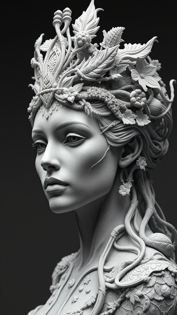 A hyper-realistic sci-fi sculpture of a woman with an intricate and elaborate crown, crafted in a black and white aesthetic. The sculpture features detailed depictions of nature, with lifelike textures and patterns carved into the surface, capturing the essence of nature's complexity and intertwining it with futuristic elements. The woman's expression is one of serene wisdom, her eyes seemingly gazing into infinity, while the crown itself appears to be composed of intertwining vines and mechanical elements, seamlessly blending organic and technological themes, reminiscent of a ZBrush masterpiece.