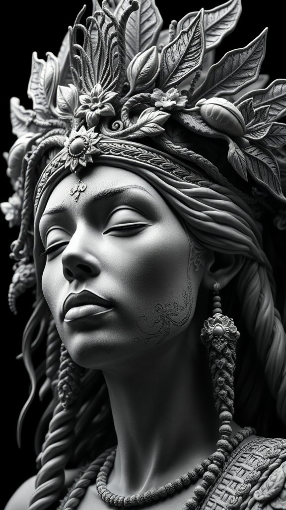 A hyper-realistic sci-fi sculpture of an Indian woman, intricately designed in black and white, featuring an elaborate crown adorned with detailed nature elements like vines and leaves, her expression serene with closed eyes, exuding an aura of otherworldly wisdom.