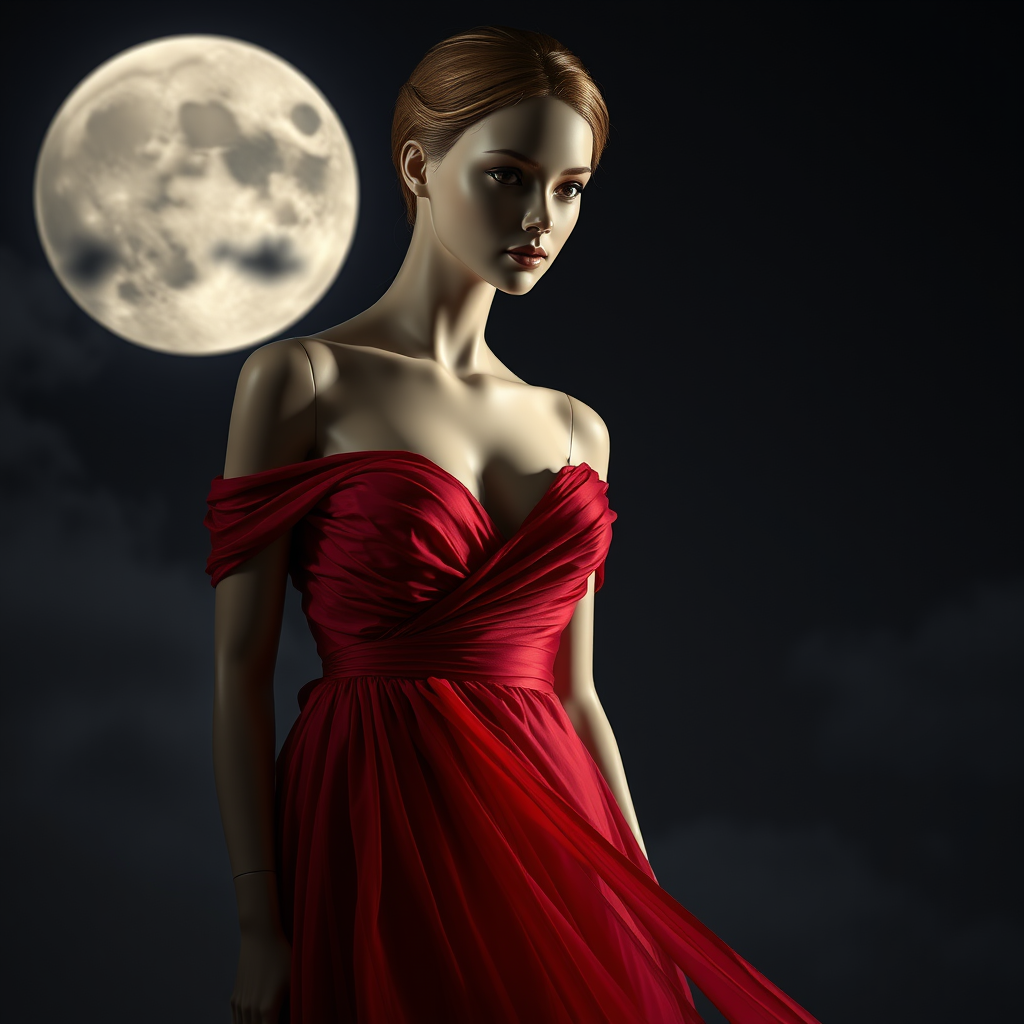 A hyper realistic ultra detailed 8k portrait of a lifelike mannequin wearing an elegant flowing crimson red gown, set against a serene full moon night. The moonlight casts intriguing shadows across the delicate contours of the mannequin's face and figure, highlighting the intricate textures of the dress fabric. The dark backdrop accentuates the mystical glow of the moon, creating a striking contrast that draws attention to the captivating scene. Gentle wisps of clouds partially veil the moon, adding depth and a sense of quiet mystery to the ethereal composition.