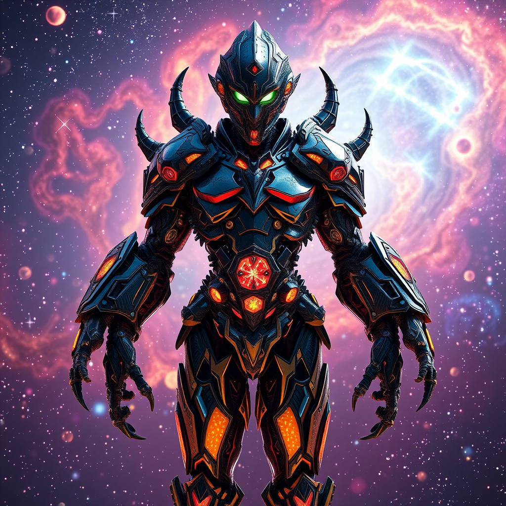A hyper-realistic, ultra-detailed depiction of a dodecahedron multiverse galaxy armor set against a vibrant galaxy background. The scene embodies t-symmetrical artwork with a focus on high fashion and extreme detailing, rendered with the precision of Unreal Engine 5 and Octane Render. The armor reflects the galaxy’s bright, vivid colors, creating a breathtaking masterpiece in 16k resolution. The character has a unique form, featuring extra limbs and unconventional proportions, with distorted anatomy and bizarre mutations. The artwork captures a surreal blend of beauty and chaos, where the extraordinary meets the cosmic in an awe-inspiring, cinematic 3D render.