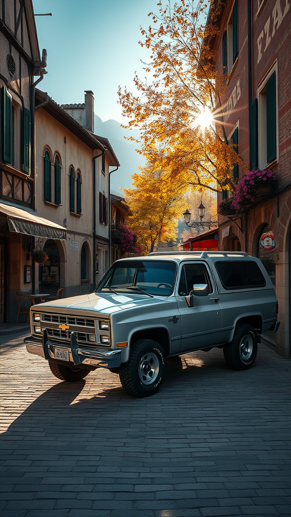 A hyper-realistic ultra-detailed image of a 1987 Silver Chevrolet Blazer K5 parked in a quaint village square at midday, capturing the sun's glow on its polished chrome and metallic body. The scene is composed with a cinematic 8K quality, framed by rustic village architecture and cobblestone streets, where vibrant autumn leaves subtly dance with the breeze. The noon sun casts intricate shadows, creating a dynamic interplay of light and texture while the distant mountains provide a majestic backdrop. The slight rust patches on the vehicle add a touch of authenticity and history to the composition.