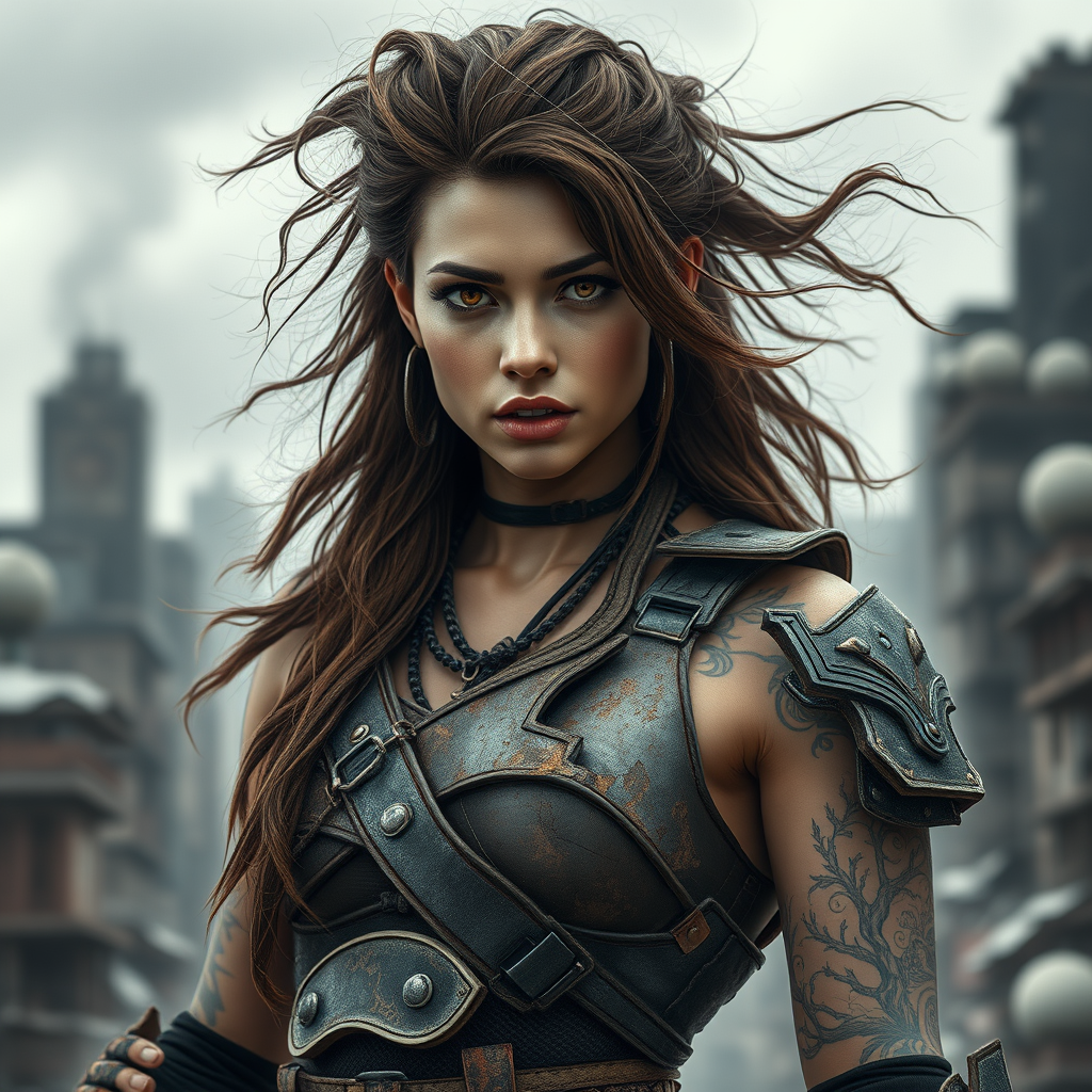 A hyper-realistic ultra-detailed image of a futuristic stunning barbarian woman, exuding confidence as she stands in a dystopian cityscape. Her tattered ensemble boasts an eclectic mix of rusty metal armor plates and rugged fabrics, perfectly complementing her long, untamed hair that cascades wildly around her shoulders. Intricate tattoos adorn her hands and body, weaving stories of war and survival across her skin. She strikes a commanding fashion pose, with every muscle defined and poised. Her hazel eyes, symmetrical and mesmerizing, gleam with an inner fire, reflecting the harsh beauty of the post-apocalyptic world around her. Her face, stunningly detailed and radiant, captures the viewer’s attention amidst a backdrop of decayed buildings and ashen skies. Each aspect of the scene is meticulously crafted, creating a captivating image of resilience and beauty thriving in chaos.