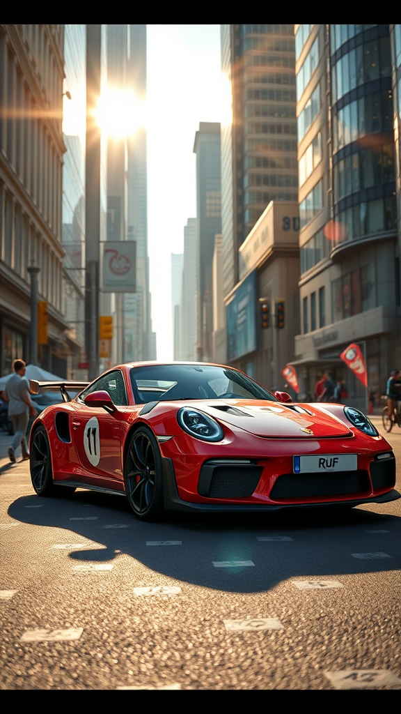 A hyper-realistic ultra-detailed image of a RUF CTR parked on a bustling city street at noon, the sun casting dynamic shadows on its sleek body. The scene is vibrant, capturing the hustle and bustle of urban life, with pedestrians and cyclists in motion around the car. The city's architecture is modern and towering, reflecting light in a dazzling display. The RUF CTR's glossy paint glimmers under the bright daylight, showcasing its aerodynamic curves and iconic design. The image is cinematic, inviting viewers to immerse themselves in the vivid atmosphere.