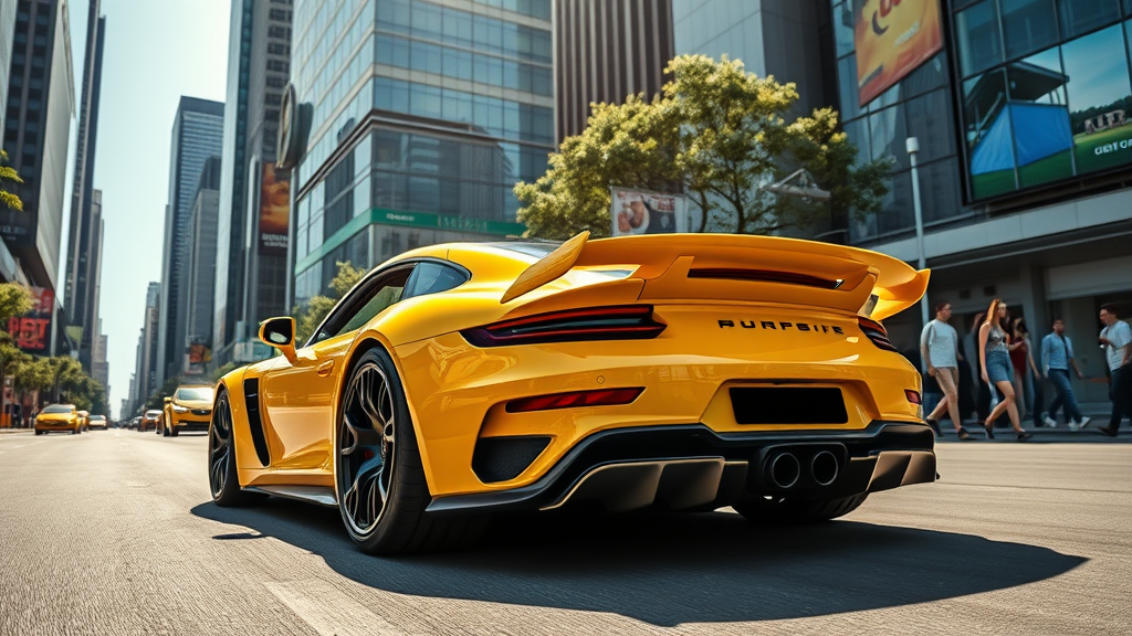 A hyper-realistic ultra-detailed image of a RUF CTR cruising through a bustling cityscape at noon, the sun casting sharp shadows on the streets. Its glossy yellow exterior gleams in the bright daylight, reflecting skyscrapers and trees along the avenue. Surrounding it are modern buildings, vibrant billboards, and pedestrians, capturing the dynamic energy of urban life. The scene is set in cinematic 8K resolution, showcasing every intricate detail of the car's design, from the air intakes to the tire treads, while soft lens flare adds a touch of drama to the midday atmosphere.
