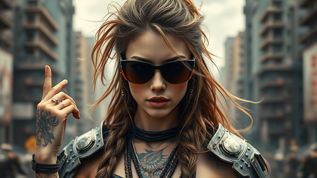 A hyper-realistic ultra-detailed image of a stunning futuristic barbarian woman set against the backdrop of a dystopian cityscape. She's donning sleek sunglasses, her tattered outfit complemented by oxidized metal armor plates, highlighting her fierce aesthetic. Her mane of long wild hair cascades with an untamed beauty. Intricate tattoos adorn her hands and body, each telling a story of survival and strength. She strikes a powerful fashion pose, her symmetrically striking hazel eyes piercing through the lens. Her face, exquisitely detailed, showcases a captivating blend of beauty and resilience. The apocalyptic environment around her buzzes with a raw, gritty texture, emphasizing the contrast between her ethereal elegance and the chaos that surrounds her. Subtle elements of tribal jewelry and futuristic gear suggest a deep history interwoven with advanced technology, creating an enchanting visual narrative that captivates the imagination.