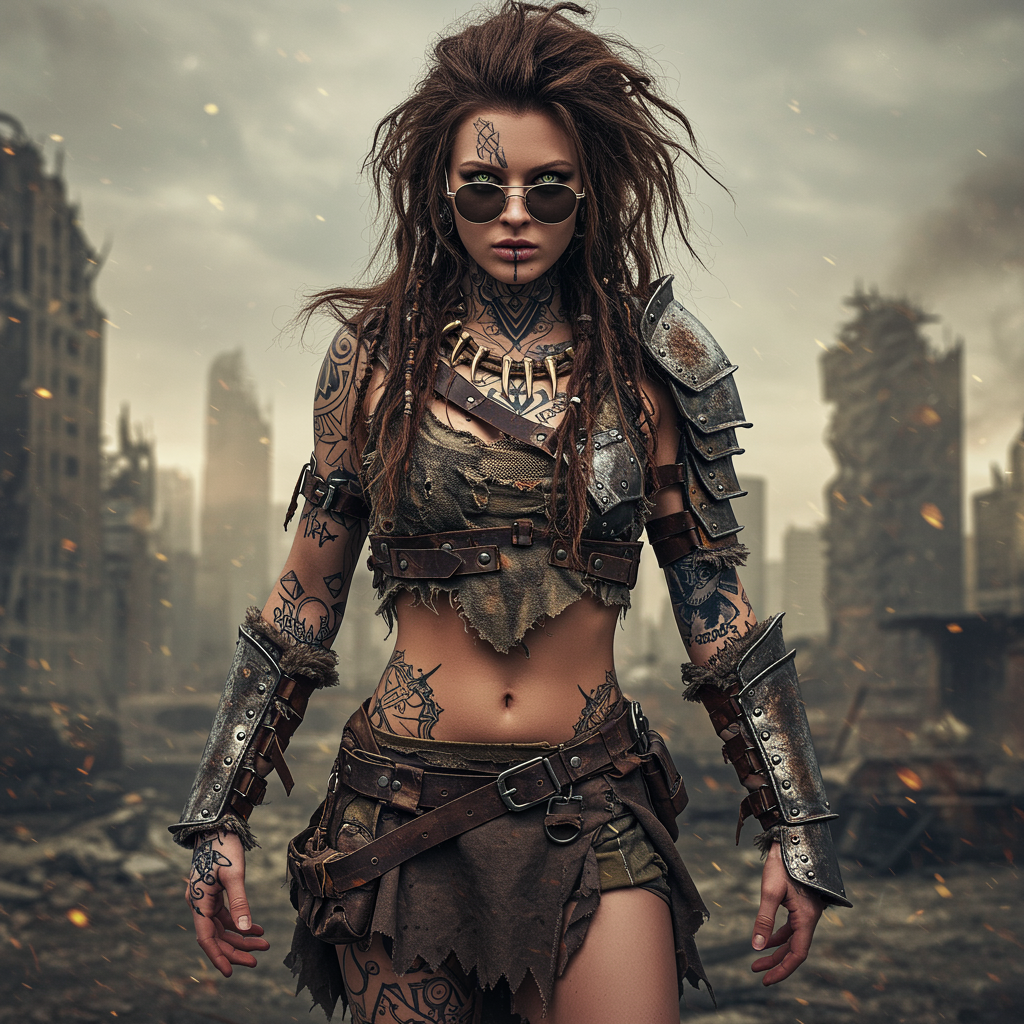 A hyper-realistic ultra-detailed photograph of a futuristic, stunning barbarian woman with sunglasses in a dystopian cityscape, wearing a tattered ensemble complemented by weathered metal armor plates. Her long, untamed hair cascades down, and intricate tattoos adorn her hands and body. She strikes a striking fashion pose, her symmetrical, captivating hazel eyes radiating intensity, set in a finely detailed, breathtaking face. The apocalyptic environment around her is depicted with exquisite detail, and she carries a distinct aura of strength and resilience in the midst of the desolate surroundings.