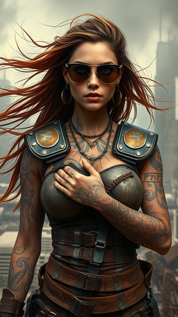 A hyper realistic ultra detailed photograph of a stunning futuristic barbarian woman striking a confident pose in a dystopian cityscape; she wears sleek sunglasses and a rugged, tattered outfit adorned with rusted metal armor plates that hint at battles fought. Her long, untamed hair flows wildly in the wind, complementing intricate tattoos that swirl across her hands and body, telling stories of resilience and power. Her strikingly beautiful hazel eyes are symmetrical and expressive, framed by a face both fierce and captivating. The apocalyptic backdrop is painted in exquisite detail, with crumbling skyscrapers and the haze of distant smog, capturing the essence of a world that is both chaotic and eerily beautiful.