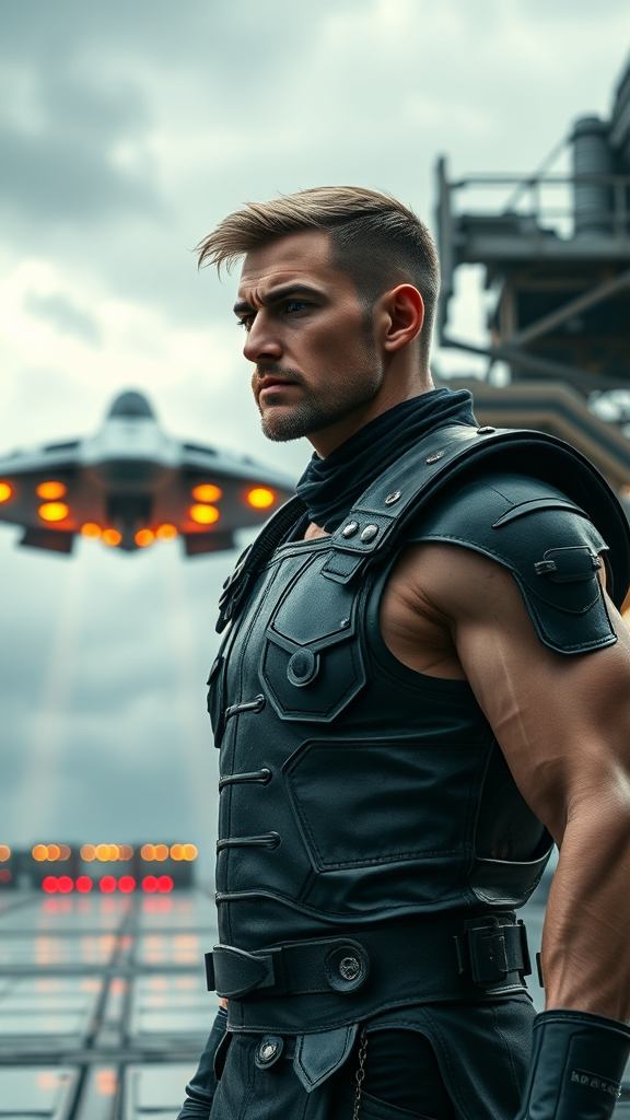 A hyper-realistic, ultra-detailed portrait of a 28-year-old Israeli Caucasian male, showcasing a full-body view with intricate triangulation from head to toe. He stands in a cinematic long shot against the backdrop of a futuristic spaceport, where a sci-fi ship is taking off amidst an overcast sky. The man exudes dominance, his sculpted muscles visible beneath a plate leather armor that is rich in fine detail. His hair is shiny, complementing his robust physique and smaller head, which enhances the alpha male aura. The lighting is a blend of natural, moody, and cinematic, with a touch of volumetric light creating a sense of depth and motion. Action-packed and epic, the scene renders in sharp 8K resolution, capturing natural textures and a vibrant environment. Despite the dynamic atmosphere, there's a harmonious balance in the natural blur and clarity, giving a sense of movement and life. This photorealistic portrayal, inspired by 'pursuit' by Gesaffelstein, utilizes cinematic rendering with ray tracing for the highest quality and detail, achieving a compelling and visually striking composition.