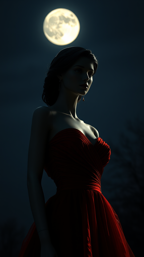 A hyper-realistic, ultra-detailed portrait of a mannequin wearing an elegant red gown, standing under the ethereal glow of a full moon on a clear night; the scene is enveloped in an atmospheric darkness, with delicate shadows and light playing across the mannequin's features and fabric, capturing the haunting beauty of the night in exquisite 8k detail.