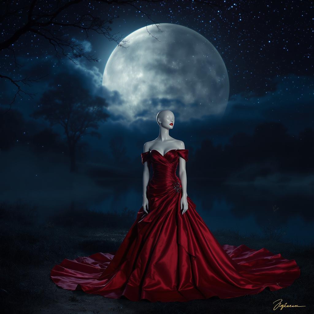 A hyper-realistic, ultra-detailed portrait of a mannequin in an elegant crimson gown, set against a mystical full moon night, with shadows dancing across the scene in the gentle moonlight. The texture of the dress shimmers subtly, capturing the ethereal glow, while the mannequin's features convey an enigmatic presence. The dark sky is dotted with faint stars, enhancing the otherworldly ambience in a resplendent 8k resolution.