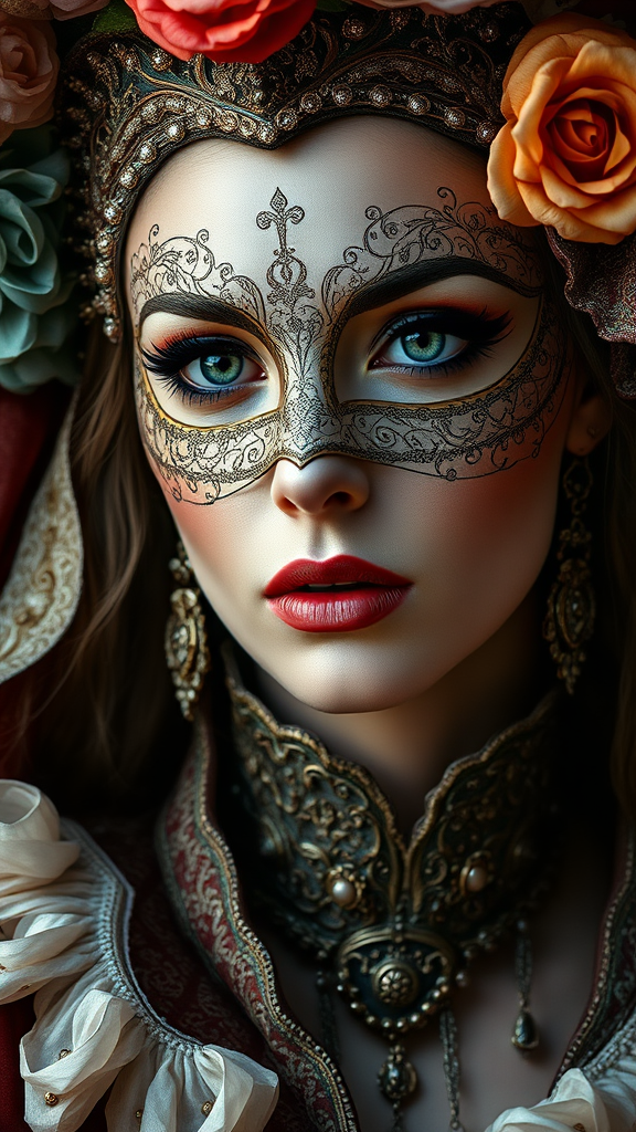 A hyper-realistic, ultra-detailed portrait of a woman inspired by the Venetian carnival, depicted in the style of an oil painting by Gerald Brom. The woman is without a mask, her face a captivating study of emotions, revealing strength and mystery. Her elaborate costume is adorned with intricate patterns and vibrant colors, reminiscent of the opulence of the Venice carnival. The delicate play of light and shadow emphasizes the texture of her skin and fabrics, giving an almost tangible depth that draws the observer into the scene. Her eyes, a striking focal point, convey a story untold, capturing the essence of the grand celebration while exuding a timeless elegance and allure.