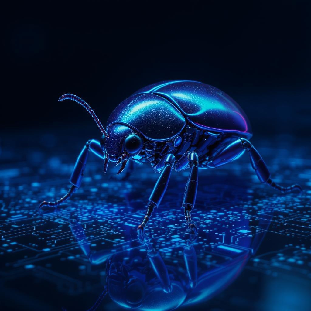 A hyper-realistic, ultra-futuristic robot beetle shimmers with iridescent cobalt hues as it perches on an advanced, responsive screen. The display reveals and details the complex workings of the robot's interior, emphasizing the cutting-edge technology that fuels its sleek, insect-like silhouette. The beetle's exoskeleton mirrors the screen's azure radiance, amplifying its metallic luster and reinforcing the aura of technological precision. The soft, tactile shell offers a striking contrast to the meticulously engineered metallic legs, crafting a captivating visual symphony that blends the futuristic with the organic. Captured with a next-generation digital camera, the image seizes every immaculate detail—from the beetle's elaborate joints and sensory apparatus to the luminous circuits visible beneath its casing. The lighting is artfully arranged to accentuate the beetle's avant-garde design, employing cool azure shades and dramatic shadows to intensify the perception of advanced technology. This creates a mesmerizing visual portrayal where art meets science, encapsulating technological innovation in a single awe-inspiring image.
