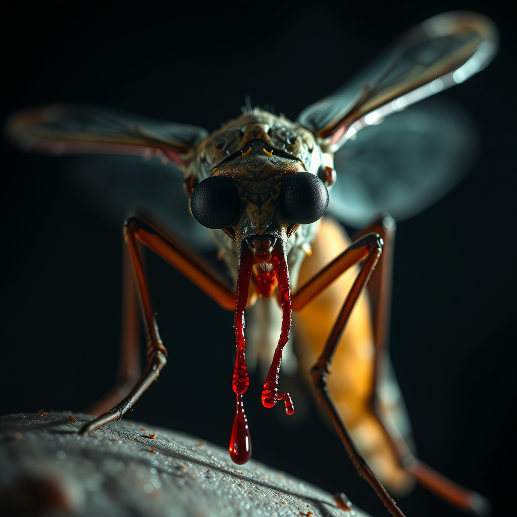 A hyper-realistic, unsettling mosquito perched in a dimly lit, eerie environment. Its intricately detailed exoskeleton glistens with a sinister sheen as droplets of blood dribble down its elongated body, reflecting the natural light. Empty, soulless black eyes stare forward, capturing the essence of horror. The creature's large, menacing fangs protrude ominously, hinting at the violence it's capable of. Scars mar its surface, telling tales of past encounters. The haunting scene is set against a shadowy backdrop that enhances its malevolent presence in this nightmarish close-up.