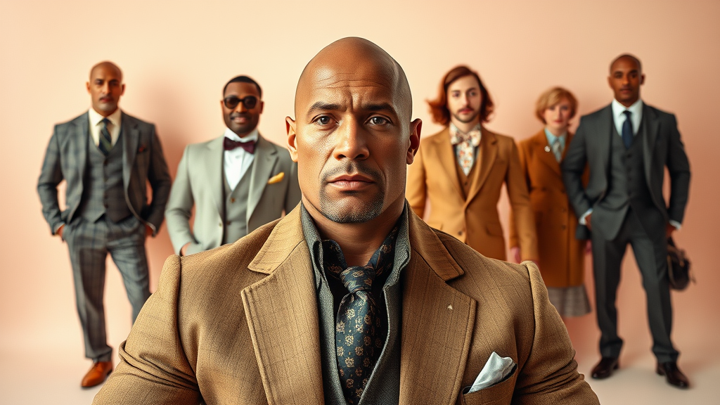 A hyper-realistic Vogue-style photoshoot featuring Dwayne Johnson embodying his character "The Rock" from a fictionalized version of The Royal Tenenbaums. The scene is set against a pastel-colored backdrop, reminiscent of Wes Anderson's signature aesthetic. The composition includes both full-body and close-up shots, highlighting sartorial elegance with quirky, vintage-inspired attire. The photograph captures the whimsical and symmetrical essence of Anderson’s style, with meticulous attention to detail in an 8k resolution, blending classical sophistication with modern charm.