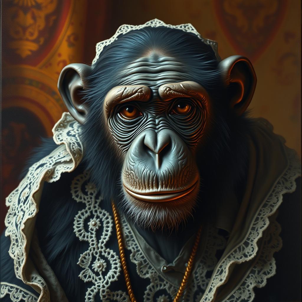 A hyperrealistic 8k classical oil painting of a chimpanzee adorned in intricate lace, surrounded by cinematic lighting that casts dramatic shadows, capturing an almost regal demeanor, with a gentle expression and soulful eyes that convey intelligence and curiosity, set against a richly detailed backdrop that enhances the depth and realism of the scene.