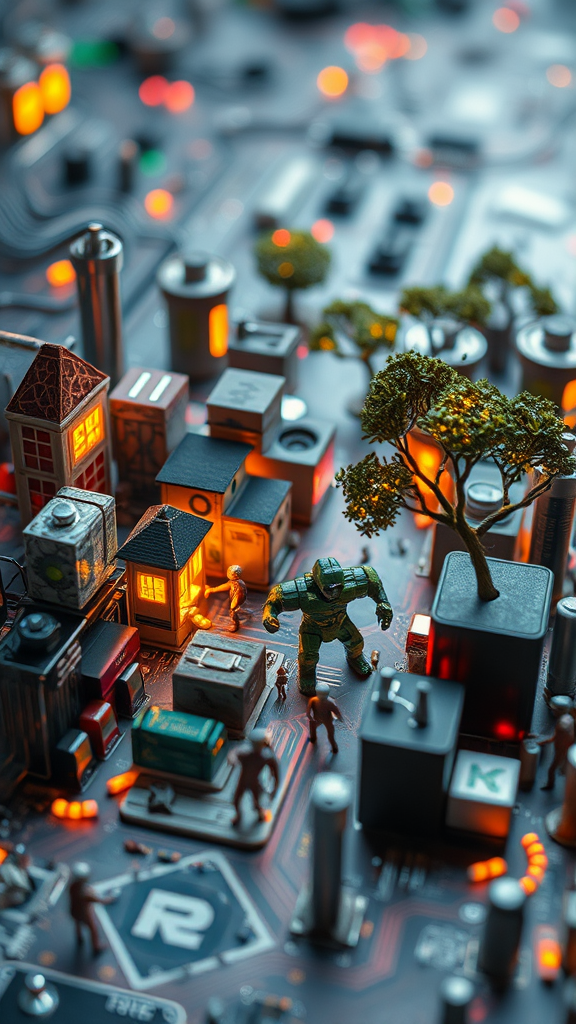 A hyperrealistic 8k portrayal of a vibrant microscopic society thriving on a circuit board, tiny humanoid figures bustling between towering capacitors and soldered connections, homes ingeniously crafted from minuscule resistors, glowing LED trees casting a gentle luminescence over lively marketplaces, intricate details showcasing their daily life amidst the vast, metallic landscape, merging technology with an imaginative world.