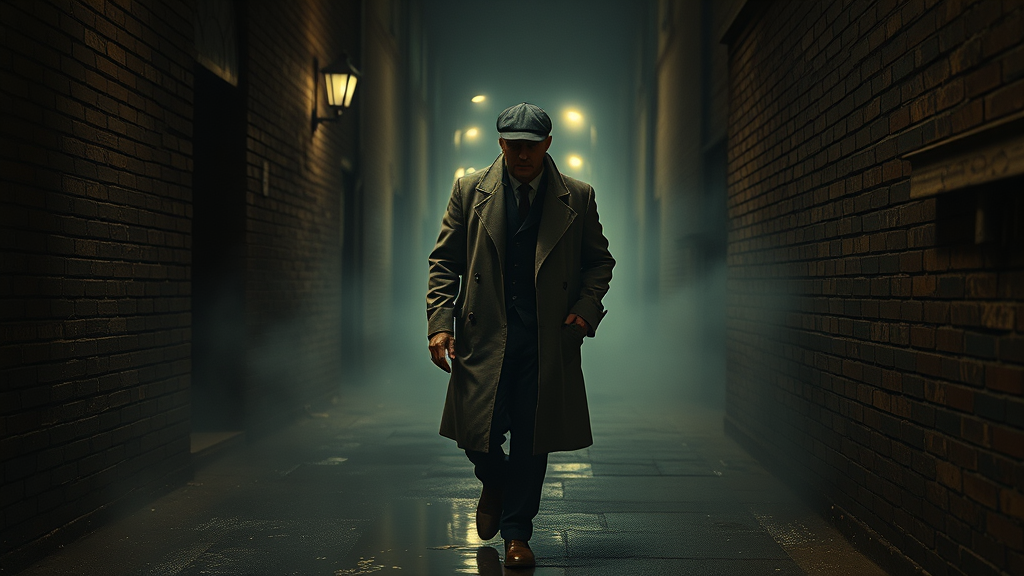 A hyperrealistic and cinematic depiction of a hardened gang member reminiscent of Peaky Blinders, striding purposefully through a foggy and smoke-filled dark alley, the atmosphere thick with tension and shadows. The scene is alive with intricate details, capturing the gritty texture of weathered brick walls and puddles reflecting the dim, flickering streetlights. The film grain adds a sense of raw intensity, enhancing the action-themed mood. The character's sharp attire, complete with a vintage flat cap and long coat, is meticulously rendered, exuding an air of authority and danger amidst the mysterious, swirling mist.