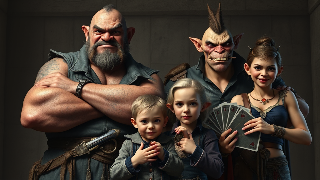 A hyperrealistic and cinematic family portrait capturing the essence of a dysfunctional orc family of five, each member exuding their unique rogue persona. The father, a burly goon with a mischievous glint in his eye, stands proudly with his arms crossed, his scars testifying to a history of brawls. The mother, a sly con-artist, elegantly dressed with a dagger subtly tucked into her belt, showcases a cunning smile hinting at her deceptive nature. Their eldest son, a lanky thief, is portrayed with nimble fingers and a smirk suggesting a recent heist. Beside him, the teenage daughter, an aspiring con-artist, holds a deck of marked cards in her hands, her expression a blend of innocence and guile. The youngest, a toddler with a mischievous grin, clutches a stolen trinket in his small fist. Volumetric lighting accentuates their rugged features, casting dramatic shadows, while the background, reminiscent of a detailed matte painting, hints at a life lived on the fringes of society.