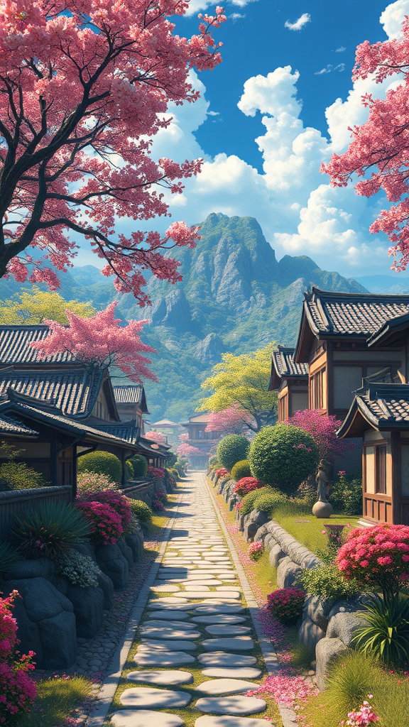 A hyperrealistic and highly detailed depiction of a dreamlike environment painted in vivid colors, set at mid-day with realistic lighting. The large-scale scene is rendered with octane precision, capturing the essence of Studio Ghibli's enchanting style as influenced by renowned artists like WLOP and Artgerm. Each element is meticulously crafted for an 8K resolution display, trending on art platforms like ArtStation, enhancing the expression of an idyllic landscape. This artwork features seamless integration of UHD and HDR10 technologies, resulting in an immersive visual experience that highlights the beauty of nature and the intricacy of dreamlike details.