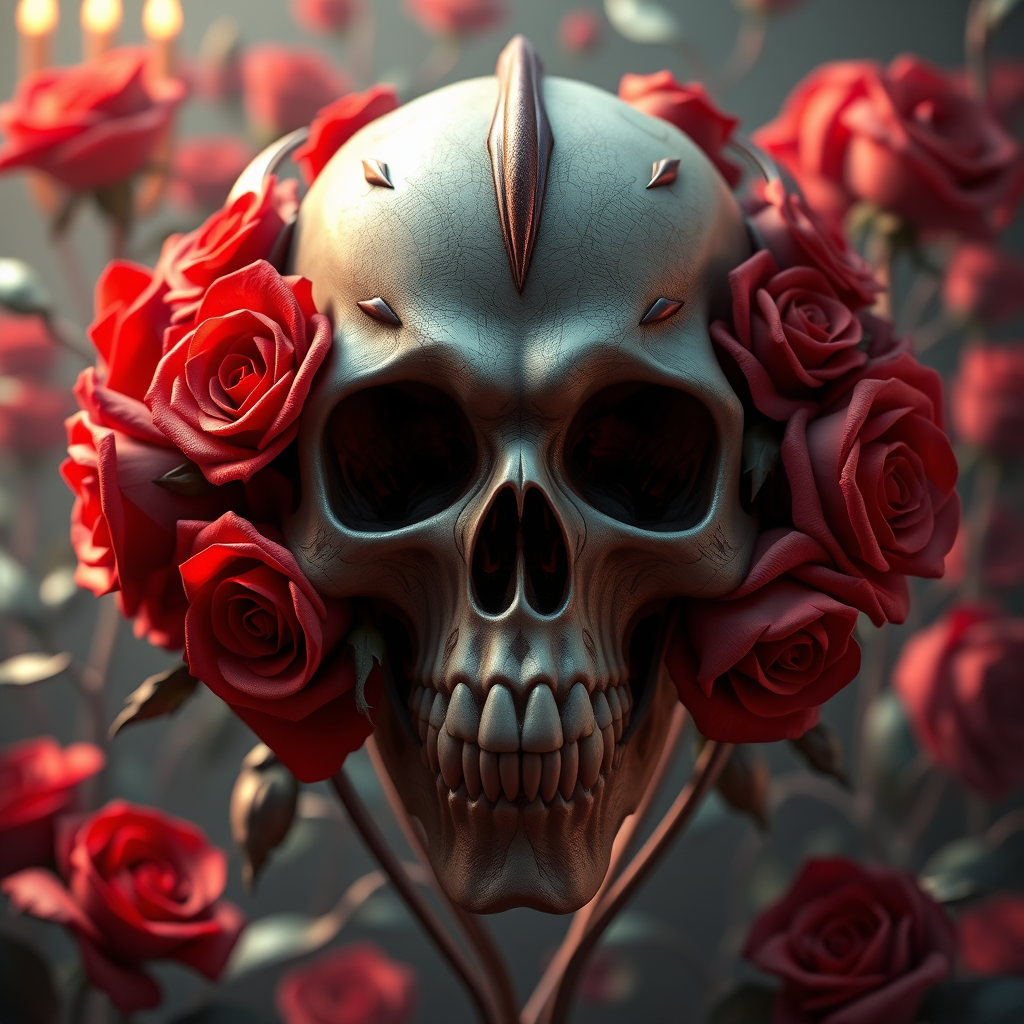 A hyperrealistic and intricate artwork depicting a skull composed of vibrant red roses, embodying the essence of organic horror with a devilish twist. Inspired by the style of H.R. Giger and infused with baroque and art nouveau elements, this photorealistic render showcases the precision of 3ds Max, V-Ray, and Unreal Engine 5. The center composition is elegantly crafted with dramatic contrast and sharp, vivid lines true to an anime and manga aesthetic. This digital masterpiece employs glow effects and a cinematic atmosphere, utilizing technologies like Octane Render, Cinema 4D, and Blender to achieve 8k resolution. The detailed, high-focus illustration boasts a big depth of field and vivid colors, bringing to life the whimsical and dark elements reminiscent of Studio Ghibli. Icons like James Jean, Jeremy Mann, and Greg Manchess influence the trending art styles from ArtStation and CGSociety, with a humorous yet sensual undertone. This artwork remains true to professional oil painting techniques, echoing the styles of Ed Blinkey and Antonio Moro while ensuring clear, sharp focus and avoiding distractions or deformities typical of 3d renders.