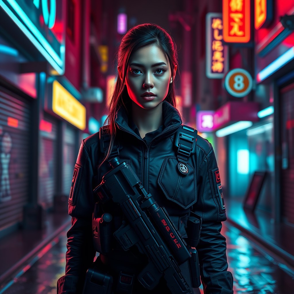 A hyperrealistic and intricately detailed full-length portrait of a woman in a combat uniform, standing in a cyberpunk city alley illuminated by dark neon lights. The scene is symmetrical with a sharp focus on her determined expression, utilizing the rule of thirds to enhance the composition. The image is incredibly detailed with vivid colors, utilizing raytracing for realistic lighting and shadows, capturing a photorealistic look. Depth of field adds a professional touch, with expertly crafted color grading highlighting the vibrant neon hues reflecting off the wet pavement and surrounding architecture, creating an immersive and dynamic scene.