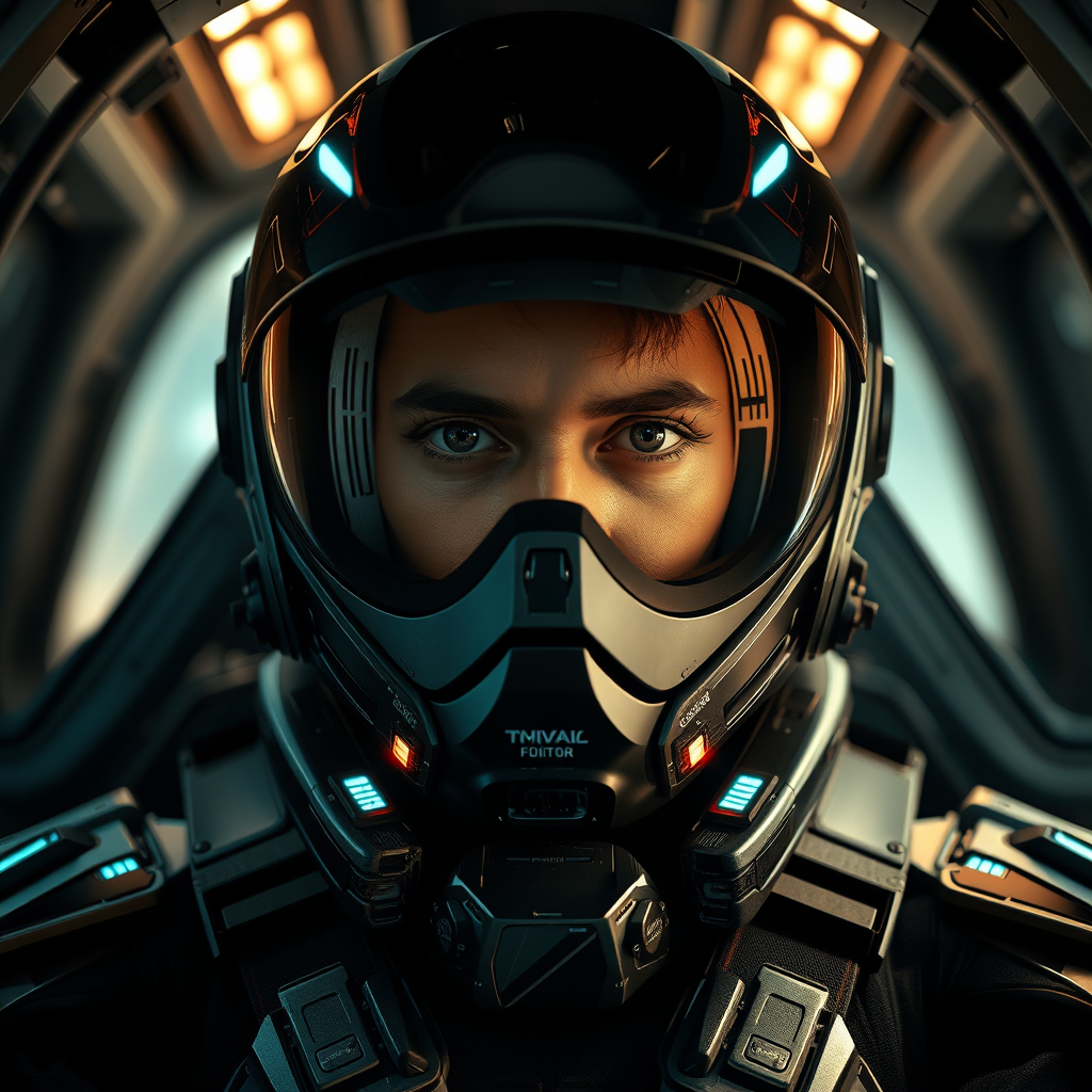 A hyperrealistic and intricately detailed portrait of a pilot with a futuristic full-face helmet, sitting in a cutting-edge cockpit. The pilot is adorned in sleek sci-fi armor, gazing directly at the viewer. The scene is imbued with a cyberpunk aesthetic, where hints of bioluminescent elements pulse subtly across the armor. The composition remains centered, exuding a cinematic allure with a sharp focus that accentuates every detail. Depth of field enhances the ambiance, while dramatic, cinematic lighting casts intriguing shadows and highlights across the helmet and cockpit, creating a vivid and immersive visual experience.