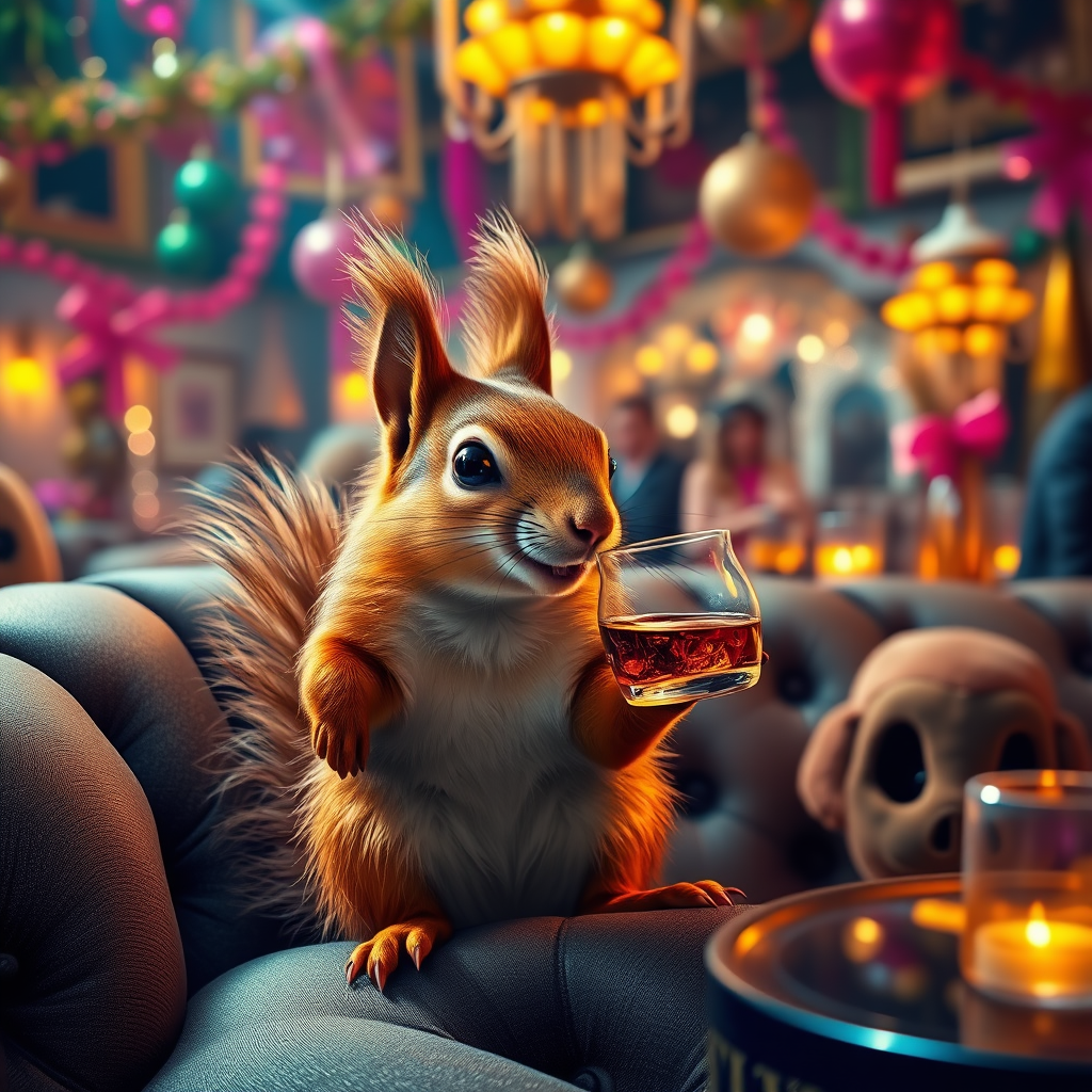 A hyperrealistic and intricately detailed scene depicting a lively squirrel at a bustling party, sipping whisky from a tiny glass, comfortably perched on a luxurious sofa, surrounded by an array of colorful party decorations and lights glinting softly, showcasing its glossy fur in stunning 8k clarity, capturing an atmosphere that's both whimsical and lifelike, set in a vibrant 16:9 aspect ratio.