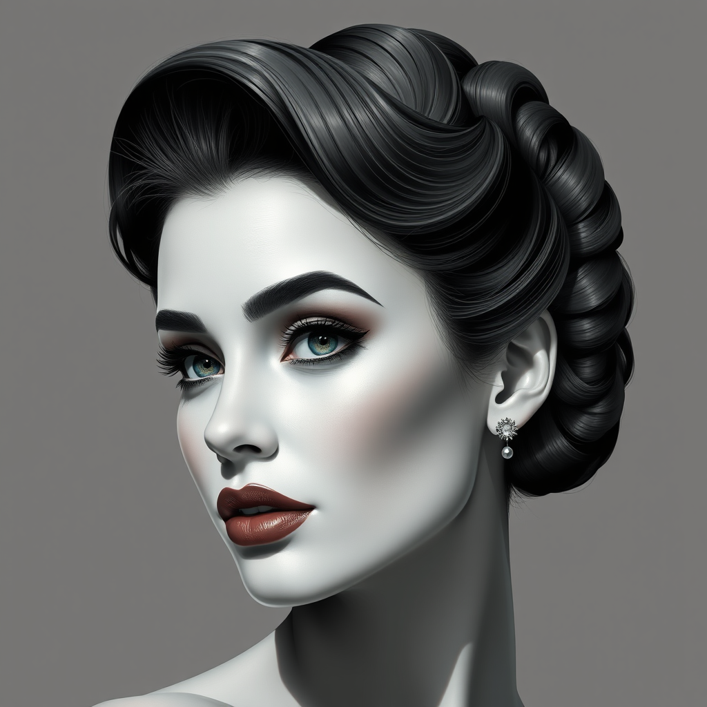 A hyperrealistic and photorealistic portrait of a woman with her hair styled in an elegant updo, reminiscent of glamorous Hollywood icons. The rendering is hyper-detailed and glossy, capturing every intricate detail with 32k UHD clarity. The illustration radiates sophistication with a trace monotone palette that enhances the realistic textures, while subtle creative flourishes add a modern twist to the classic aura.