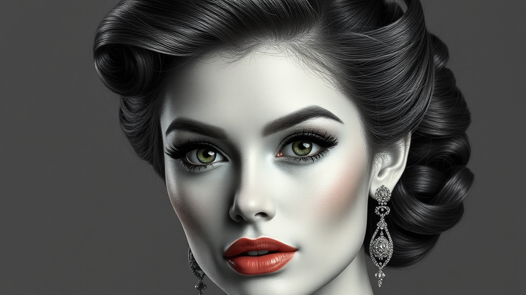 A hyperrealistic and photorealistic portrait of a woman with an elegant updo hairstyle, reminiscent of glamorous Hollywood icons. The image captures intricate details and glossy textures, showcasing a realistic and hyper-detailed rendering in a monotone palette. The composition highlights her striking features with a 32k UHD quality, emphasizing the shimmer and polish of her look. This detailed character illustration blends classic allure with modern precision and is set in a narrow aspect ratio.