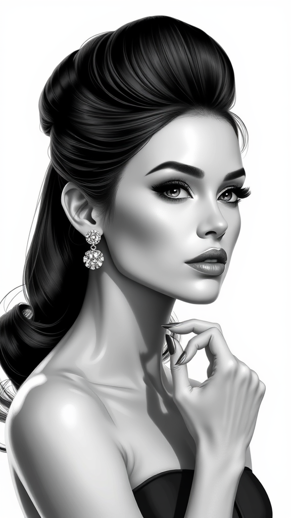 A hyperrealistic and photorealistic portrait of a woman with an elegant updo, inspired by glamorous Hollywood photography. The artwork features realistic and hyper-detailed renderings, showcasing a shiny and glossy finish. The character illustration is in monotone, with fine attention to detail, presented in stunning 32k ultra-high definition resolution. The composition captures the sophistication and allure of classic Hollywood style, with subtle creative enhancements to emphasize her grace and elegance, maintaining a balanced aspect ratio of 77:78 for a harmonious visual presentation.