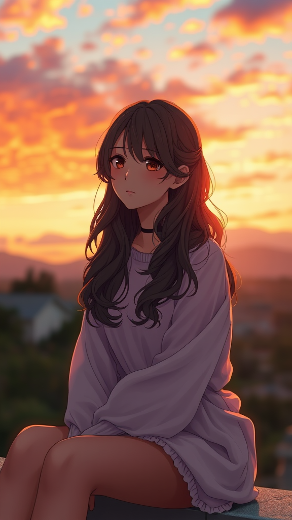 A hyperrealistic anime scene depicting a stunningly beautiful girl with wavy brown medium-length hair sitting in a cinematic pose. The setting is at sunset around 8:30 pm, with a gorgeous, vividly detailed sky as the backdrop. The lighting is intricate, sharp, and focused, shot with an 85mm lens at f/1.8 to capture every nuance of the scene. The girl's detailed clothing complements her appearance, adding to the overall charm. The atmosphere is enhanced by gentle volumetric fog, contributing to the serene beauty of the moment. The image appears as if trending on Instagram and Tumblr, presented in HDR 4K and 8K quality, created with sharp focus and rich textures. The composition avoids common pitfalls such as poorly drawn elements or disfigurements, ensuring that anatomy and proportions are elegantly maintained, presenting a polished and sophisticated piece.