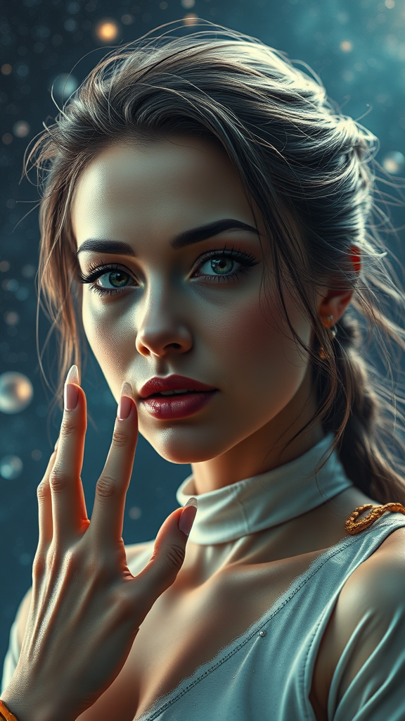 A hyperrealistic character portrait of a woman in a space-themed setting, captured with dynamic lighting. The artwork is highly detailed, showcasing features with precision. The scene resembles a fantastic screenshot art, presenting a mesmerizing cosmic backdrop. Despite slight textural errors and occasional blurring, the essence of the character's striking presence remains intact. There are minor anatomical anomalies, such as irregular fingers or digit counts, enhancing the otherworldly feel. The image might include cropped elements and subtle visual distortions, lending it an abstract charm. Occasional JPEG artifacts and unintentional marks suggest a raw artistic spontaneity, with some areas appearing fuzzy or out of focus, adding layers to the narrative. The artwork feels simultaneously captivating and mysterious, with hints of surrealism embedded within its aesthetic imperfections.