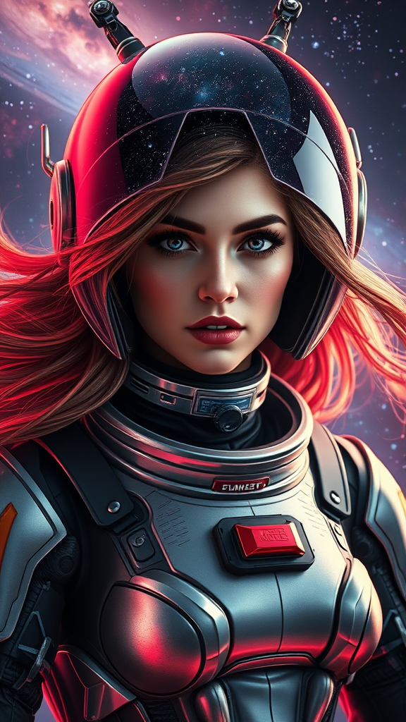 A hyperrealistic character portrait of a woman in a sleek, retro-futuristic space suit, her helmet revealing flowing hair that resembles the Milky Way galaxy. The artwork captures the intricate details of her armor, reflecting a blend of vintage sci-fi and modern aesthetics. The dynamic lighting emphasizes her determined expression, as cosmic nebulae and stardust weave through her hair, adding a fantastical element. The setting evokes a vibrant space environment, as if captured in an official, high-detail screenshot from an imaginative sci-fi universe. Subtle creative elements enhance the overall composition, making it both captivating and awe-inspiring.