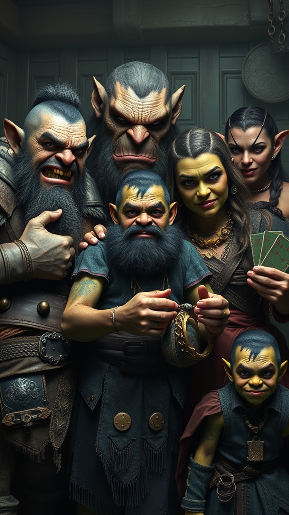 A hyperrealistic, cinematic family portrait capturing a dysfunctional orc family of five. Each member embodies the essence of thieves, con-artists, and goons, with distinctive features hinting at their unique roles in the underworld. The patriarch, a burly orc with a cunning grin and scarred arms, stands protectively at the center, his sharp eyes gleaming with mischief. To his right, the matriarch, draped in luxurious yet slightly tattered fabrics, holds a bag of coins, her eyes reflecting a shrewd intelligence. A younger orc, agile and wiry, clutches a set of ornate lockpicks, exuding youthful arrogance. Beside him, a brawny sibling with an intimidating presence, wearing a patchwork of leather armor pieces, flexes their muscles subtly, hinting at raw power. On the edge, a smaller orc with nimble fingers and a sly smile holds a deck of marked cards, their gaze darting with quick wit. The scene is bathed in atmospheric, volumetric lighting that cascades over them, casting dramatic shadows across their features. Set against a backdrop resembling a matte painting of their disheveled, rustic hideout, cluttered with stolen loot, the portrait reveals the family's crude yet charming character, united by their cunning ways.