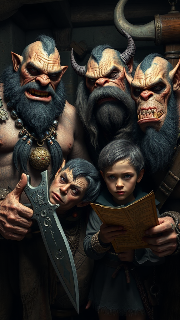 A hyperrealistic cinematic family portrait featuring a dysfunctional orc family of five, each with distinct personalities. The patriarch, a burly, scarred leader with a sly grin, holds a dagger with engravings; his partner, an enigmatic figure with ornate jewelry, exuding charm and deceit. Their eldest offspring, a towering brute with a fierce gaze, stands protectively, while the middle child, a nimble pickpocket, showcases sleight of hand with a stolen coin. The youngest, a cunning strategist, peers through spectacles, holding a mysterious map. Volumetric lighting casts dramatic shadows, highlighting their rugged, textured skin and weathered attire in a richly detailed, matte painting setting of a dimly lit hideout cluttered with ill-gotten treasures.