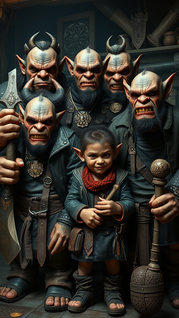 A hyperrealistic cinematic family portrait of a dysfunctional orc family of five, each with distinct personalities as thieves, con-artists, and goons; the patriarch, a hulking figure with a jagged scar over his eye, exudes a grim authority while gripping an ornate dagger; the matriarch, adorned in mismatched stolen jewelry, wears an amused smirk, hinting at her cunning; the eldest son, sporting a leather jacket and gold-toothed grin, leans casually with a lock-picking kit; the middle child, a wiry daughter with quick hands, clutches a coin purse, eyes glittering with mischief; the youngest, a bulky teenager, stands awkwardly, holding a cudgel, emulating strength; set against a dimly lit, cluttered lair, with volumetric lighting casting dramatic shadows and transforming the scene into a masterful matte painting that captures the essence of their chaotic existence.