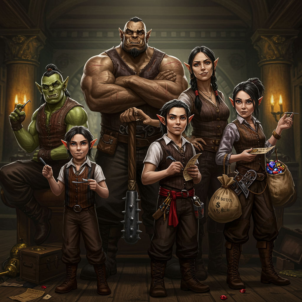 A hyperrealistic cinematic family portrait of a dysfunctional orc family of five, each with distinct characteristics reflecting their rogue lifestyle. The father, a burly, intimidating figure with scars and a mischievous glint in his eyes, stands with crossed arms. Next to him, the mother, exuding an air of sly cunning, holds a voluminous bag of stolen jewels. Their eldest, a lanky son with nimble fingers tinted by ink, is in the act of crafting counterfeit documents. Beside him, the youngest daughter cleverly hides a set of lockpicks behind her back, her wide eyes betraying her excitement. The middle sibling, a muscular enforcer, smirks as he casually leans on a heavy club. Volumetric lighting casts dramatic shadows, enhancing the tension and chaos that underlies their bond. The setting is a dimly lit, lavish hideout adorned with luxurious stolen goods, brought to life with a detailed matte painting that captures the gritty yet fantastical ambiance of their world.