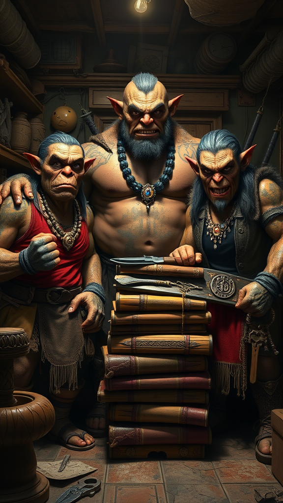 A hyperrealistic, cinematic family portrait showcasing a dysfunctional orc family of five, each embodying their roles as thieves, con-artists, and goons. The setting is a dimly lit, ramshackle hideout filled with pilfered treasures and worn-out furniture. Volumetric lighting casts dramatic shadows, highlighting the cunning expressions and rugged features of the orcs. The patriarch, a burly figure with scars and a knowing smirk, stands at the center, flanked by his sly, jewel-adorned partner and their three mischievous offspring, each clutching tools of their trade. The matte painting background merges urban decay with a hint of the orc's rough-hewn heritage, adding depth to the scene. The youngest orc, a budding con-artist, playfully peers from behind a stack of stolen goods, eyes twinkling with mischief. The atmosphere exudes a chaotic harmony unique to their shared life of crime.