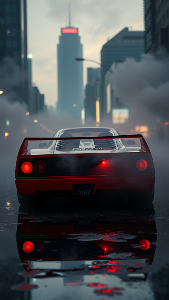 A hyperrealistic, cinematic shot of a Ferrari F40 from a slightly elevated three-quarters rear angle captures its muscular contours and iconic design under the moody glow of dusk. The car is framed against a vibrant cityscape, with towering skyscrapers and diffuse neon signs peeking through the thick, swirling mist that envelops the scene. The dense smoke drifts languidly around the car, forming textured layers of haze that scatter light and imbue the scene with a surreal atmosphere. Reflective puddles are scattered across the glistening street surface, mirroring the F40’s striking red body and the ambient glow from the urban lights above. The rich, warm glow of the F40’s taillights—one a vivid red, the other an amber hue—pierces the smoke in sharp detail, with delicate reflections shimmering in the puddles below. Nearby city lights cast subtle reflections that dance across the car’s surface, highlighting its curves with realistic gleams and adding depth to its sleek, bold lines. The background cityscape, softened by the smoke, reveals details like skyscraper silhouettes, glimmering lights, and darkened alleyways that create a vivid, immersive urban environment. Volumetric lighting pierces through the smoke, casting gentle beams across the F40’s contours, accentuating its aggressive stance on the city street. Every detail is captured with masterful realism, from the gleaming wheels to the subtle texture of the street, creating a truly breathtaking masterpiece, fit for ArtStation.
