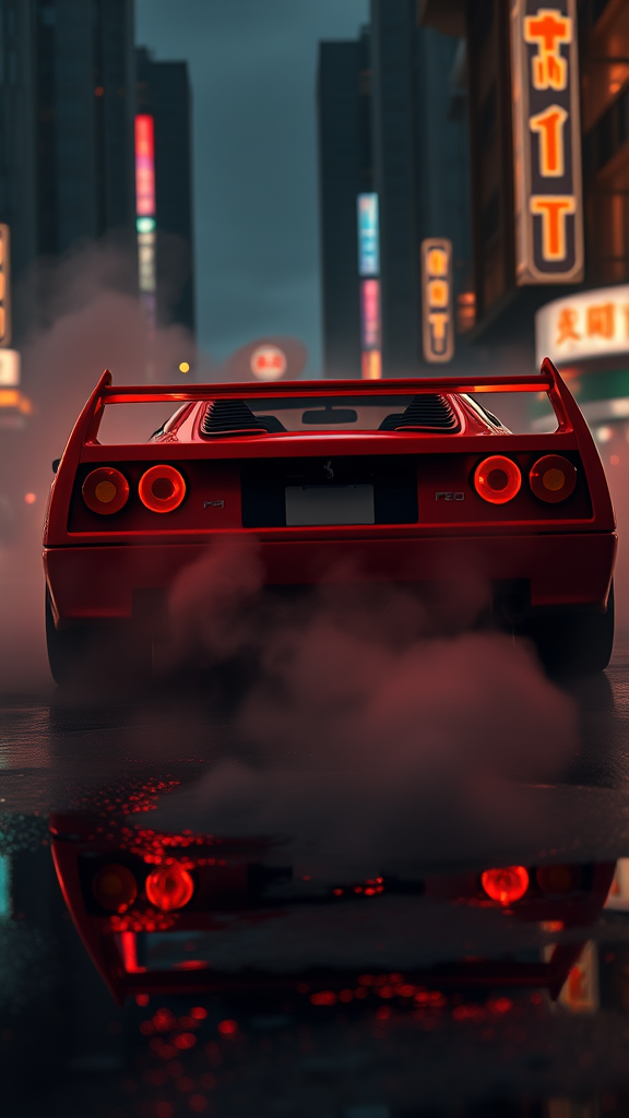 A hyperrealistic, cinematic shot of a Ferrari F40 from a slightly elevated three-quarters rear angle, capturing its muscular contours and iconic design under dim dusk lighting. The car is set against a bustling cityscape, with towering high-rise buildings and distant neon signs faintly visible through the thick, swirling smoke that envelops the scene. The dense smoke drifts heavily around the car, creating textured layers of haze that diffuse light and lend the scene an intense, almost surreal atmosphere. Reflective puddles are scattered across the wet street surface, mirroring the F40’s vibrant red body and the glow from the city lights above. The rich, warm glow of the F40’s taillights—left taillight a fiery red, and the right taillight a deep amber hue—cuts through the smoke in sharp, luminous detail, with subtle reflections visible in the puddles below. Subtle reflections from nearby city lights ripple across the car’s surface, accentuating its curves with realistic gleams and adding depth to its sleek, angular lines. The background cityscape is softened by the smoke, but details like skyscraper silhouettes, scattered lights, and shadowed alleyways create an atmospheric, immersive urban environment. Volumetric lighting streams through the smoke, casting soft beams across the F40’s contours, enhancing its aggressive stance on the city street. Every detail is rendered in masterful realism, from the polished wheels to the fine grit on the street surface, creating a truly breathtaking masterpiece, perfect for ArtStation.