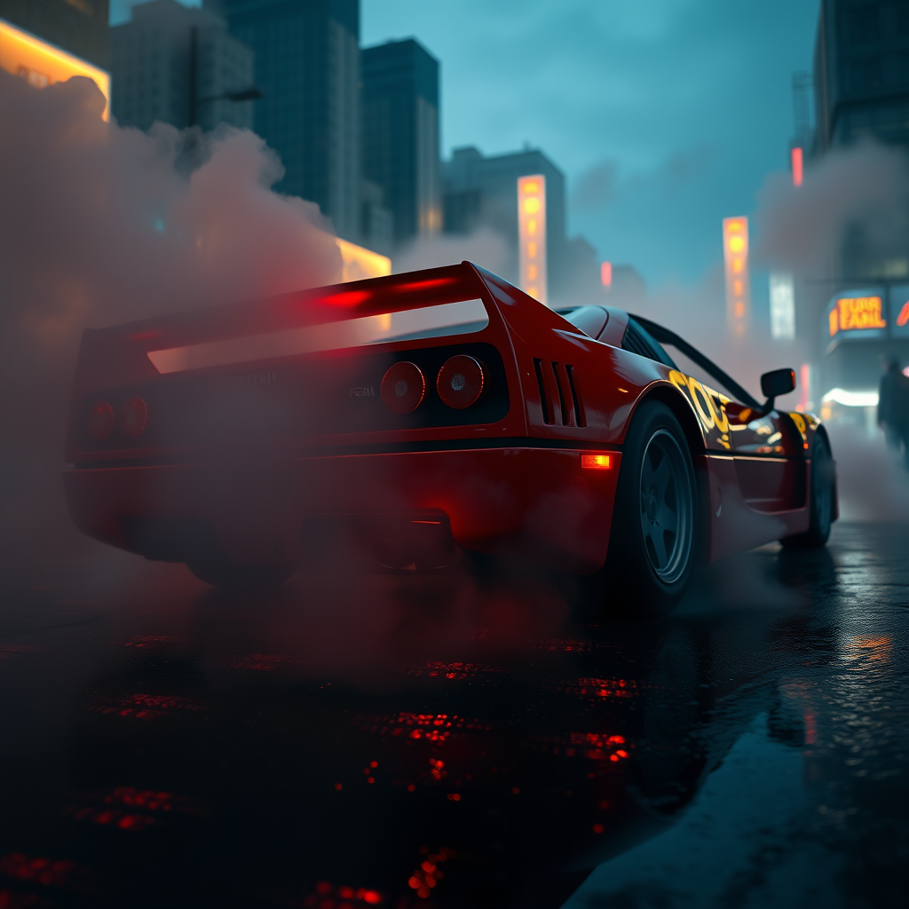 A hyperrealistic, cinematic shot of a Ferrari F40 from a slightly elevated three-quarters rear angle, highlighting its muscular contours and iconic design in the dimness of twilight. The car is set against a vibrant cityscape, with towering high-rise buildings and distant, flickering neon signs partially obscured by thick, swirling smoke that envelops the scene. The dense smoke drifts heavily around the F40, creating textured layers of haze that diffuses light and give the scene an intense, surreal atmosphere. Reflective puddles dot the wet street surface, capturing the F40’s vivid red paint and the city lights' glow. The rich, warm illumination of the F40’s taillights—left taillight a deep red, and the right taillight emitting an amber glow—pierces through the smoke with sharp, luminous clarity, reflected subtly in the puddles below. Nearby city lights cast subtle reflections across the car’s surface, emphasizing its curves with realistic gleams and adding depth to its sleek, angular lines. The background cityscape, softened by the smoke, reveals details like the silhouettes of skyscrapers, scattered lights, and shadowed alleys, crafting an atmospheric, immersive urban environment. Volumetric lighting filters through the smoke, casting gentle beams over the F40’s features, accentuating its imposing stance on the city street. Each element is rendered with exceptional realism, from the polished wheel rims to the fine texture of the street, creating a breathtaking masterpiece, nuanced and vivid, perfect for an ArtStation showcase.