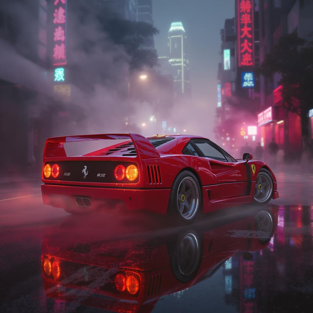 A hyperrealistic, cinematic shot of a Ferrari F40 from a slightly elevated three-quarters rear angle captures its muscular contours and iconic design under the soft glow of twilight. The car is set against a vibrant cityscape, with towering high-rise buildings and distant neon signs barely visible through the thick, swirling mist that envelops the scene. This dense mist shifts around the car, creating textured layers of haze that diffuse light and lend the scene an intense, otherworldly atmosphere. Scattered reflective puddles on the wet street mirror the F40’s vivid red body and the glow from the city lights above. The warm glow of the F40’s taillights—one a fiery red, the other an amber hue—pierces through the mist in sharp, vivid detail, with subtle reflections visible in the puddles below. Reflections from nearby city lights ripple and dance across the car’s surface, accentuating its curves with realistic gleams, adding depth to its sleek, angular lines. The background cityscape is cloaked by the mist, but silhouettes of skyscrapers, scattered lights, and shadowed alleys create an inviting, immersive urban environment. Streams of volumetric lighting cut through the mist, casting gentle beams across the F40’s contours, enhancing its powerful stance on the city street. Every detail is rendered with impeccable realism, from the gleaming wheels to the fine texture of the street surface, crafting a truly captivating masterpiece, perfect for ArtStation. Small creative touches subtly shift elements while preserving the core essence of the scene.