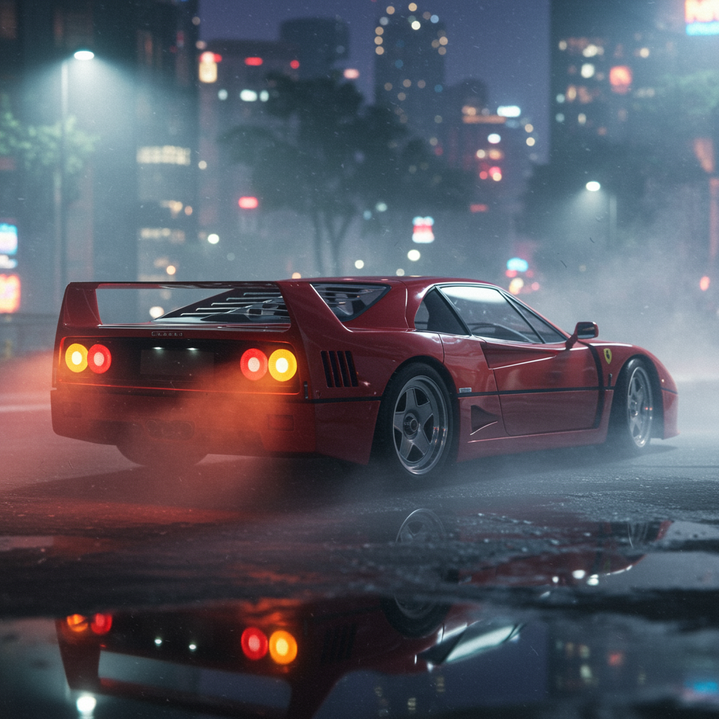 A hyperrealistic, cinematic shot of a Ferrari F40 from a slightly elevated three-quarters rear angle, capturing its muscular contours and iconic design under the dim ambiance of twilight. Nestled in a vibrant cityscape, the scene reveals towering skyscrapers and distant neon signs faintly discernible through thick, swirling fog that envelops the environment. The dense mist drifts languidly around the car, weaving textured layers of haze that soften light, enveloping the scene in an otherworldly ambience. Reflective puddles dot the slick street surface, mirroring the F40’s vibrant red hue and the shimmer of city lights overhead. The deep, warm glow of the F40’s taillights—left taillight blazing a fiery ruby, the right an amber glow—pierces the mist in sharp, brilliant detail, with gentle reflections shimmering in the puddles below. Nearby city lights ripple subtly across the F40’s sleek surface, highlighting its sensuous curves with luminous gleams and adding depth to its sculpted lines. The cityscape backdrop is softened by the fog, yet details like the silhouettes of skyscrapers, twinkling lights, and shadowy alleyways emerge to create a rich, absorbing urban setting. Soft streams of volumetric lighting pierce through the fog, casting delicate beams across the F40’s contours, enhancing its assertive stance on the urban street. Every element is depicted in exquisite realism, from the polished rims to the delicately textured street surface, crafting a stunning masterpiece ideal for ArtStation.