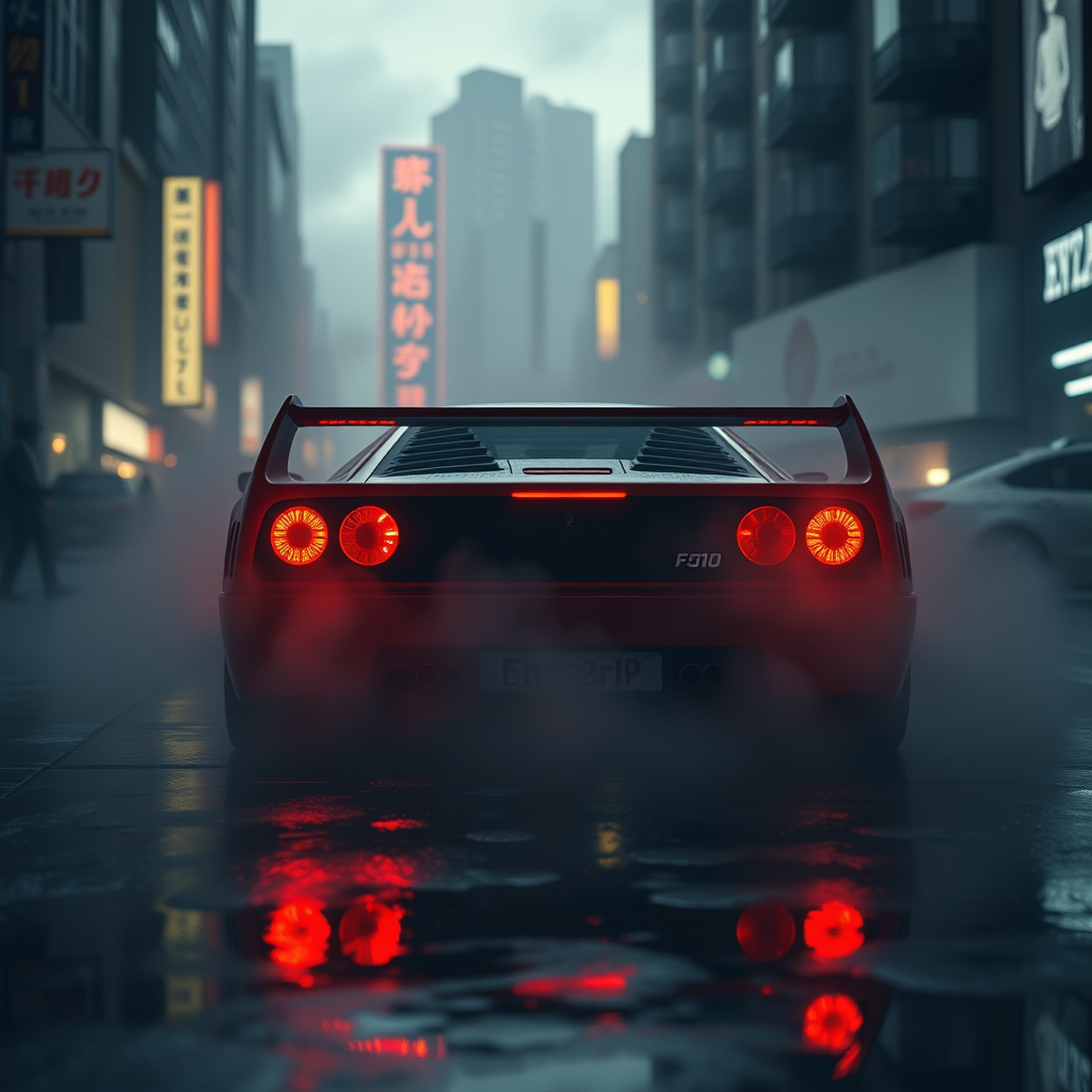 A hyperrealistic, cinematic shot of a Ferrari F40 viewed from a slightly elevated three-quarters rear angle, capturing its powerful contours and iconic design under the dim, moody lighting of dusk. The car is positioned amidst a bustling urban landscape, surrounded by towering high-rise buildings and faintly glowing neon signs that loom through the thick, swirling mist enveloping the scene. The dense haze drifts around the F40, creating layered textures that diffuse the ambient light, lending an intense, almost dreamlike aura to the setting. Reflective puddles dot the damp street, mirroring the F40’s striking red paintwork and the city lights above. The warm glow of the F40’s taillights—one a vivid red and the other an amber hue—pierces through the fog in sharp, radiant detail, with their reflections shimmering in the puddles below. Glimmers from nearby city lights dance across the car’s surface, highlighting its curves with realistic gleams and adding depth to its sleek, angular lines. While the backdrop cityscape is softened by the haze, visible elements like the silhouettes of skyscrapers, scattered lights, and shadowy alleyways contribute to an atmospheric, immersive urban scene. Soft beams of volumetric light stream through the mist, casting gentle highlights on the F40’s body, accentuating its aggressive stance on the city street. Every detail is rendered with masterful realism—from the polished wheels to the fine grit on the pavement—creating a breathtaking masterpiece suitable for ArtStation, with slight creative variations maintaining the core essence.