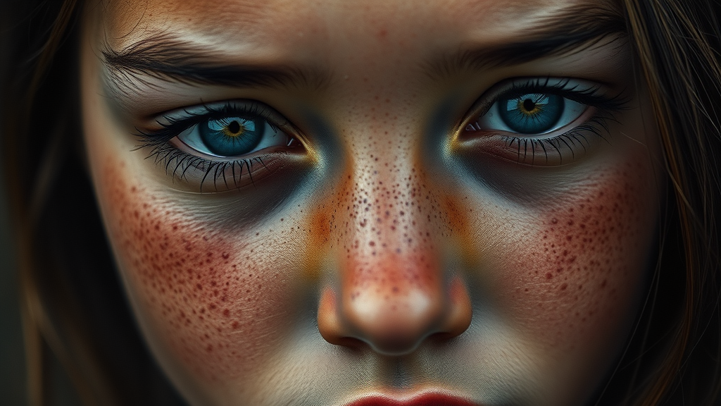 A hyperrealistic close-up of a beautiful teenage girl with freckles, her brown skin resembling rich soil, capturing a timid and vulnerable expression. The image draws inspiration from the styles of Albert Watson and Antoni Pitxot, blending a charcoal texture with the evocative, dramatic flair of a Graham Humphreys album cover. The girl's smooth shaded features are highlighted with an epic atmospheric quality, set against a 3:4 aspect ratio that enhances her contemplative expression and timeless beauty.