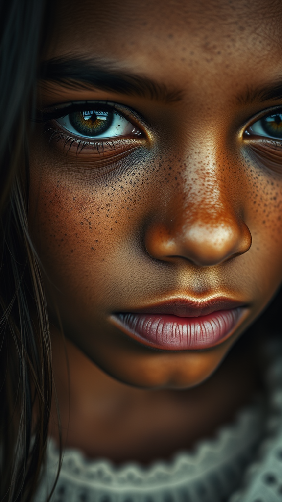 A hyperrealistic close-up portrait of a beautiful teenage girl with brown skin resembling rich soil, her face adorned with delicate freckles. Her expression is timid and vulnerable, capturing a sense of innocence and depth. Inspired by the styles of Albert Watson and Antoni Pitxot, the image blends elements reminiscent of an epic music album cover with the textured, smooth shading of charcoal art. The composition echoes Graham Humphreys' artistic touch, emphasizing the girl's soulful eyes and serene presence, framed in an aesthetically pleasing 3:4 aspect ratio.