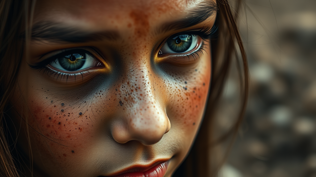 A hyperrealistic close-up portrait of a beautiful teenage girl with freckles scattered across her face, her brown skin rich and earthy like soil. The image captures a timid and vulnerable expression, reminiscent of a Graham Humphreys illustration. Inspired by the style of Albert Watson, the artwork is infused with the surreal touch of Antoni Pitxot. Designed as an epic music album cover, the portrait features smooth, charcoal-shaded tones that enhance the depth and intricacy of her features, creating a striking visual experience.