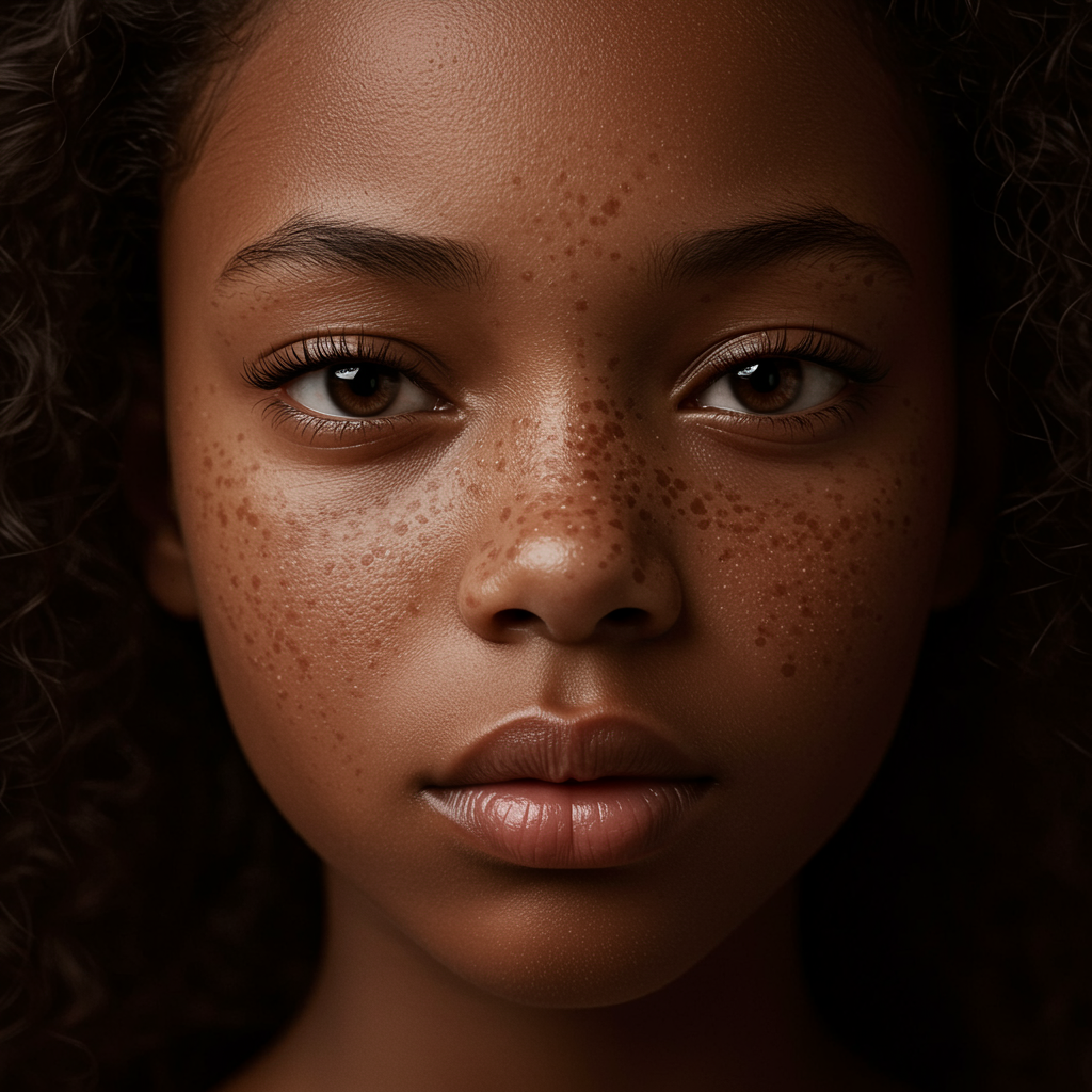 A hyperrealistic close-up portrait of a beautiful teenage girl with freckles scattered across her face, radiating a gentle and timid expression. Her brown skin, reminiscent of rich, fertile soil, is depicted with smooth, blended charcoal strokes. The artwork, inspired by the styles of Albert Watson and Antoni Pitxot, echoes a classic Graham Humphreys album cover vibe. Her eyes reveal a sense of vulnerability, inviting the viewer into her introspective world, as if setting the scene for an epic musical narrative.