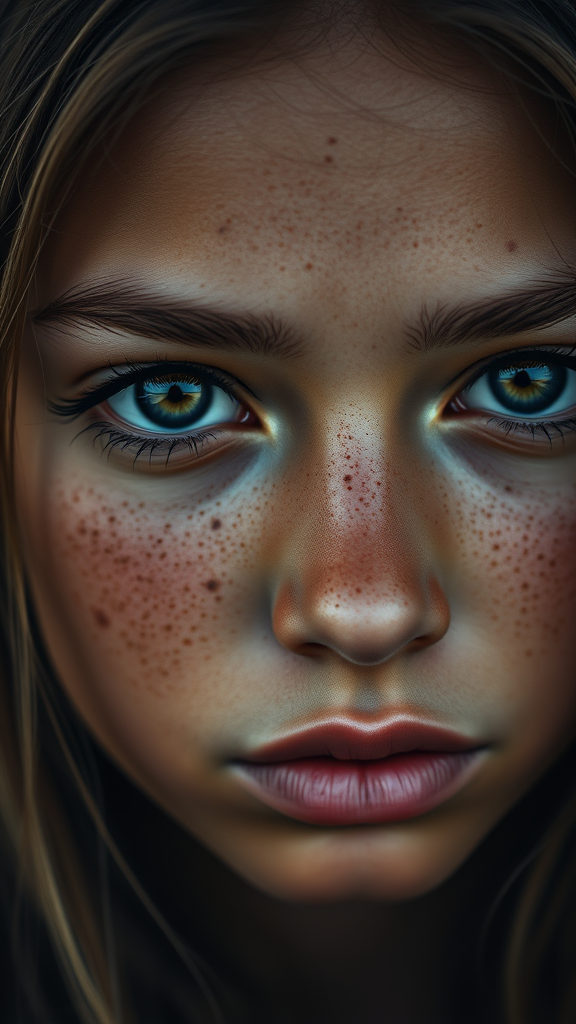 A hyperrealistic close-up portrait of a freckled teen girl with brown skin reminiscent of rich soil. Inspired by Albert Watson and Antoni Pitxot, the focus is on her timid and vulnerable expression that captures a blend of youth and beauty. The composition, ideal for an epic music album cover, employs the smooth shaded techniques found in charcoal works, reminiscent of Graham Humphreys' style. The portrait displays an intricate interplay of light and shadow, highlighting her delicate features and creating an evocative and profound visual narrative.